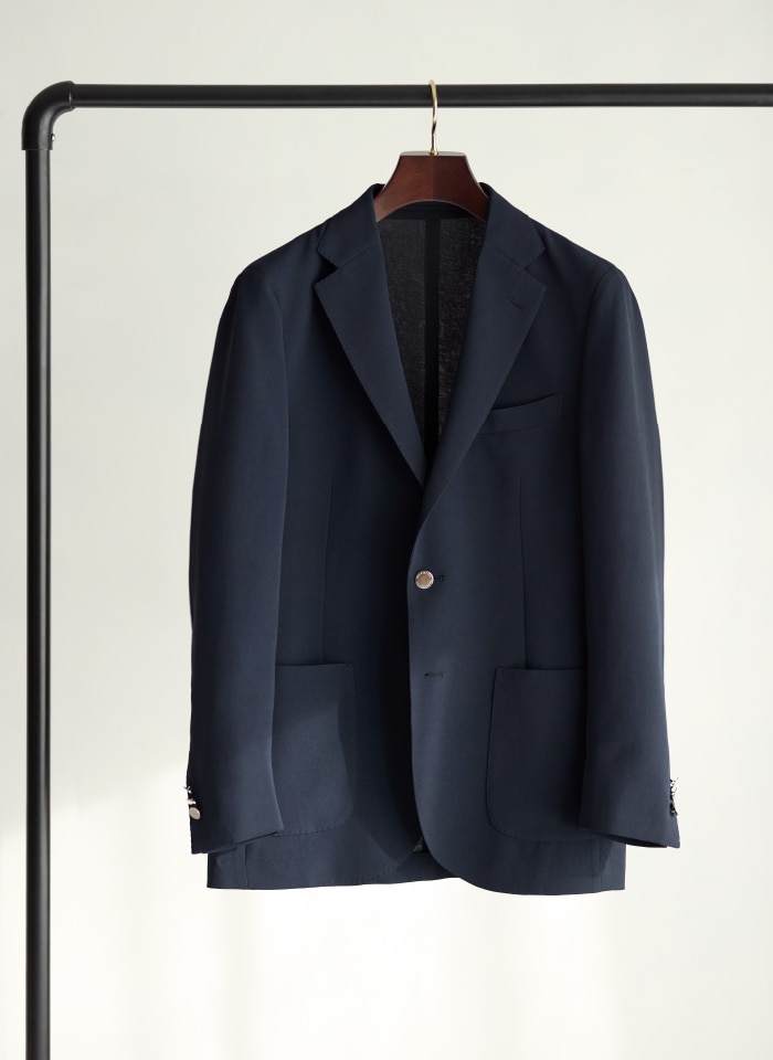 ペットボトル由来の再生素材を使用したブレザー。シワになりにくく、家庭で洗えて、ストレッチも効いた高機能モデル。オリジナルのメタルボタンがトラッドな雰囲気を演出。