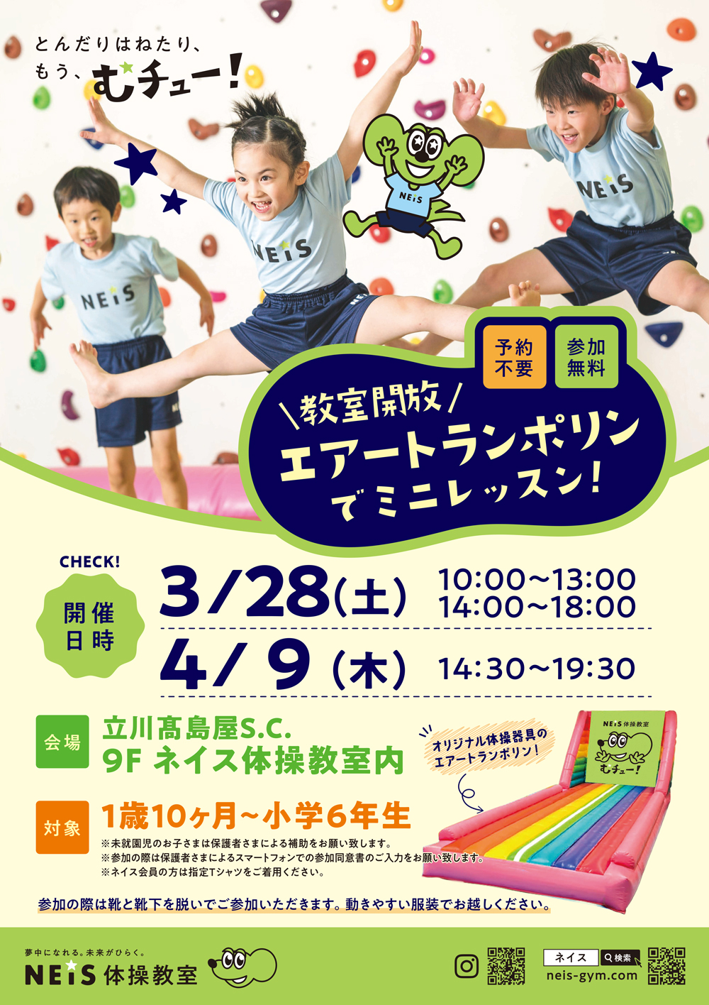 3月28日(土)、4月9日(木)、9F ネイス体操教室にて無料開放イベントを開催いたします!