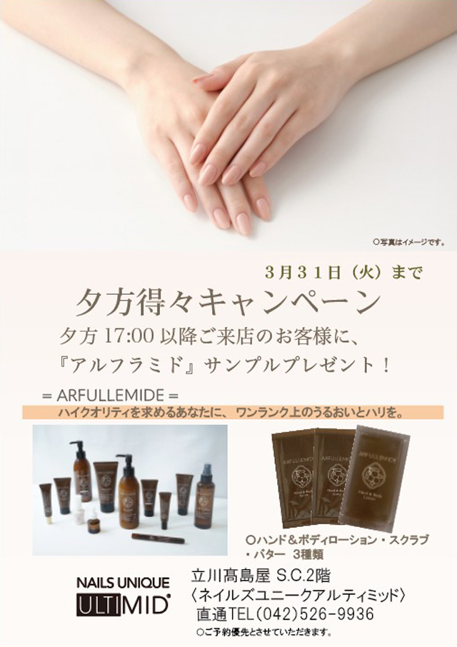 3月31日(火)までの期間中、17:00以降ご来店のお客様に「アルフラミド」サンプルをプレゼントいたします。