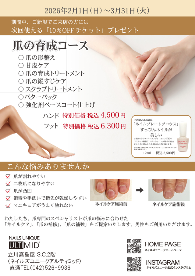 2月1日(日)~3月31日(火)の期間、人気の「爪の育成コース」が特別価格に♪