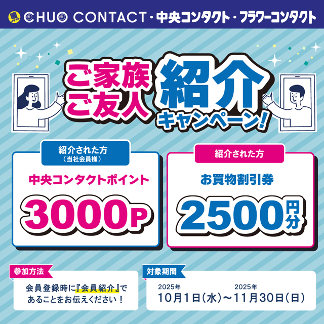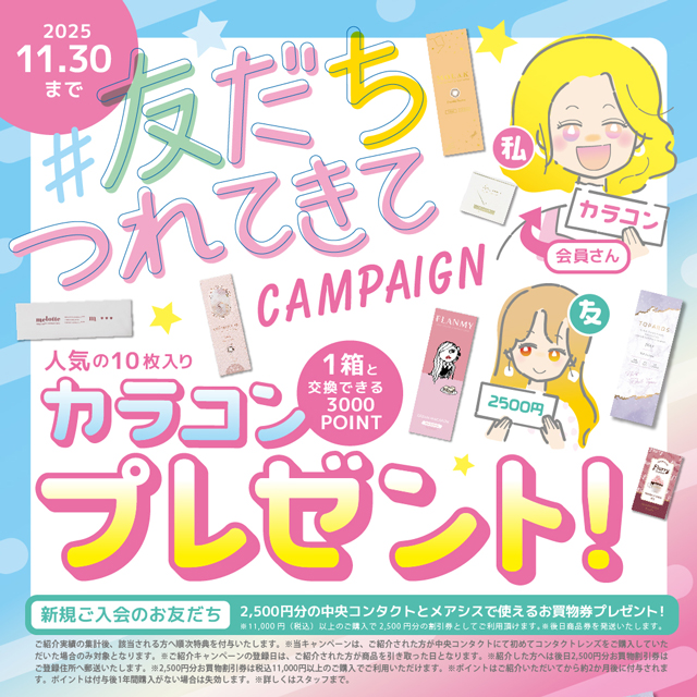 ご家族・ご友人の紹介で、双方にカラコン1箱と交換できるポイントやお買物券をプレゼント♪
