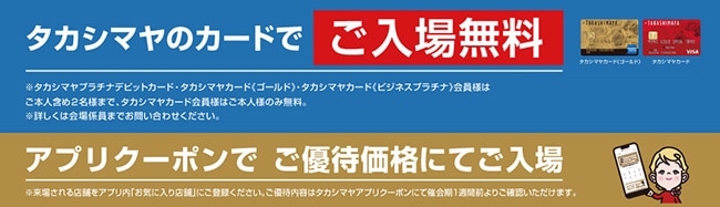 ※障がい者手帳・デジタル障がい者手帳(身体障がい者手帳・精神障がい者保健福祉手帳・療育手帳)をお持ちのお客様は、手帳をご提示いただいたご本人様ならびにご同伴者様1名様まで無料となります。タカシマヤの株主様ご優待カードをお持ちのお客様は、ご本人様を含め3名様まで無料。タカシマヤプラチナデビットカード、タカシマヤカード《ゴールド》をお持ちのお客様は、ご本人様含め2名様まで無料。タカシマヤカードをお持ちのお客様、タカシマヤ友の会会員証・スゴ積み会員証をお持ちのお客様は、ご本人様のみ無料。タカシマヤセゾンカードをお持ちのお客様はご本人様のみ一般・当日料金から50%割引。タカシマヤアプリ会員様は、ご本人様のみ300円引き(アプリ会員様は当日券販売のみ)。