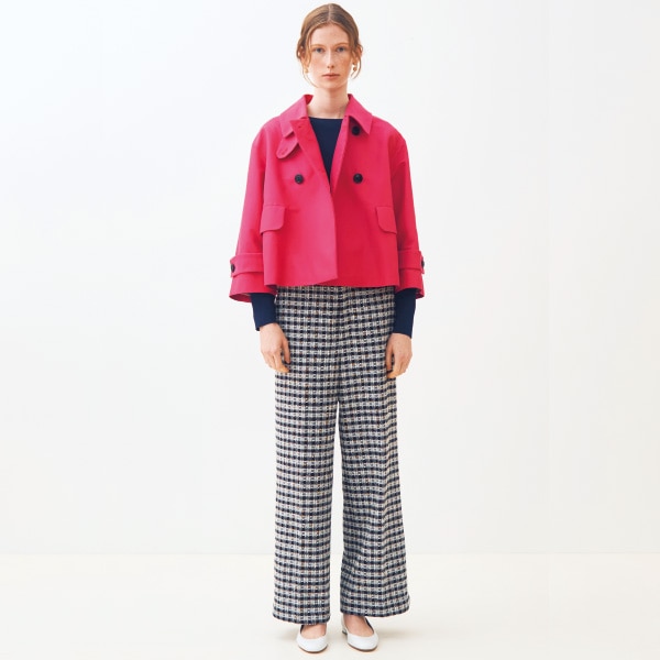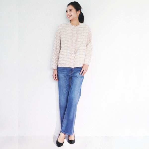 カジュアルにも、キレイめにも、どちらも楽しめるツイードジャケット。ピンク×デニムブルーのコントラストが新鮮な旬のコーディネートです。