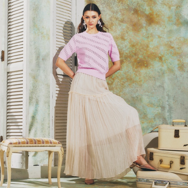 表面の凹凸感と穴あきデザインが目をひく一着。ロングスカートやボリュームのあるパンツとのスタイリングがおすすめです。
