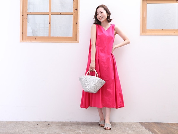 ワンピースのシルエットにこだわり、日本人の体型を意識した肩ダーツや胸ダーツ、ノースリーブの袖ぐりを工夫し、着心地が良くきれいなシルエットを作りました。