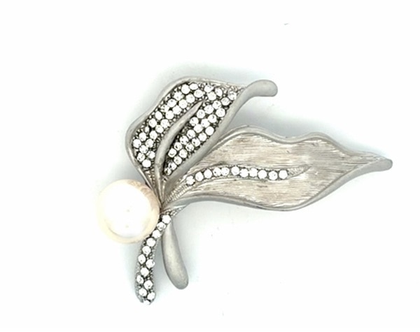 シンプルなリーフモチーフにキラキラビジューと大きめの貝パールを使用。普段使いしやすいブローチです。