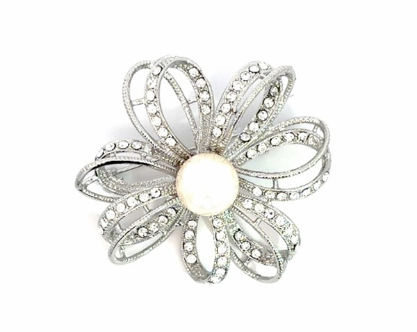 大きめの貝パールと優しい曲線のリボンモチーフのデザインブローチです。胸元にはもちろん帽子やバッグのワンポイントにもおすすめです。