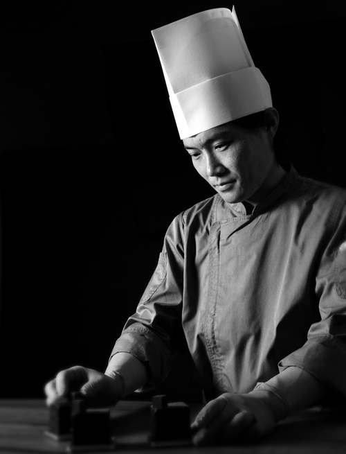 〈トシ・ヨロイヅカ〉ショコラノワールとショコラ・オ・レを合わせたガナッシュ。ブルターニュ地方のゲランド塩がアクセントに。