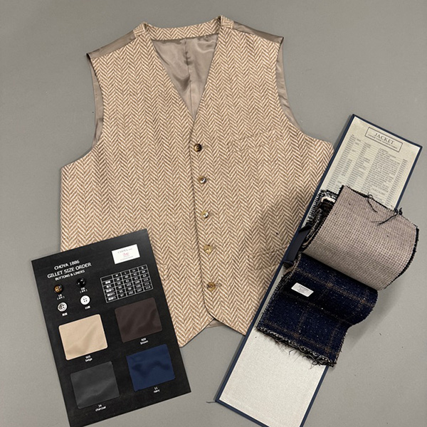 裏地やボタンもセレクト出来るジレのサイズオーダー。