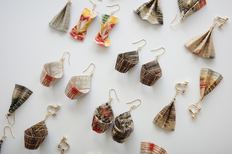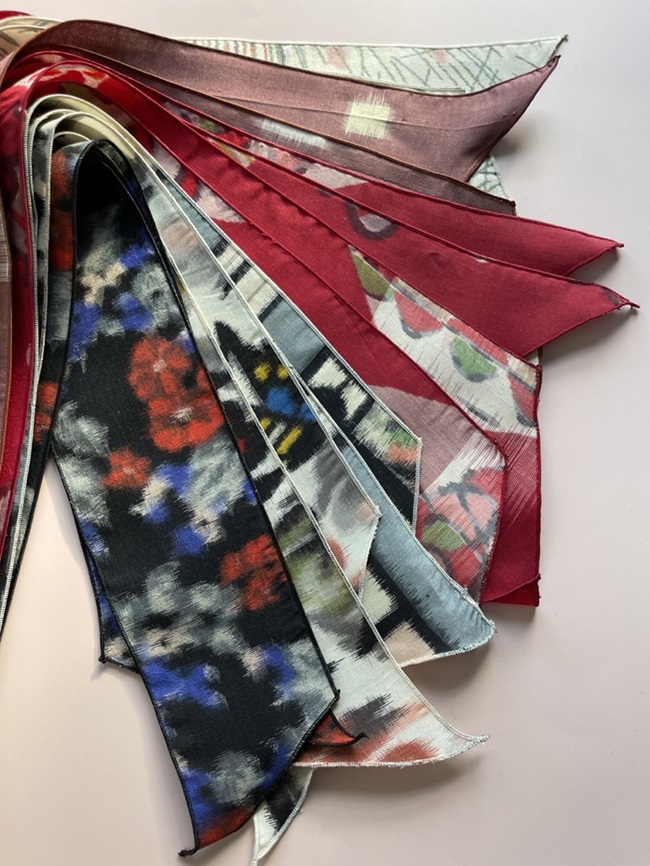 100年前に織られた絹織物「伊勢崎銘仙」をアップサイクルし、 現代に蘇らせた一点物のワンピースやスカート、スカーフやアクセサリー。