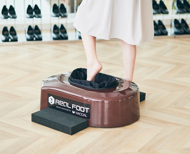 かかとのカーブまで測ることができるワコールオリジナル足型自動計測機を使い、片足約15秒でお客様の足型を計測。