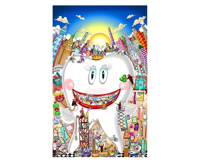 大胆に描かれた歯のキャラクターを、まるでニューヨークのビル建設かのように綺麗にしている人々が細かに描かれています。