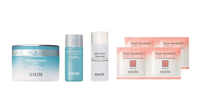 ゆらぎがちな肌を潤いで満たす低刺激のジェル状保湿液の現品に、軽やかな高保湿化粧とクレンジングのミニサイズ、日焼け止めのパウチ4包もついたキット。