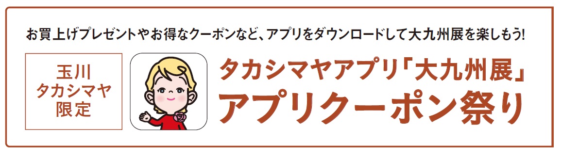 タカシマヤアプリをダウンロードして「お買上げプレゼントクーポン」や「お得なクーポン」など、『大九州展』をお楽しみください。