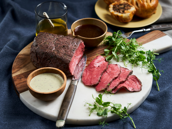 赤身肉の旨みを最大限に引き出した極上のローストビーフ。牛もも肉を、厳選した岩塩とブラックペッパーを掻き込み、オリーブオイルに12時間漬け込み熟成させています。