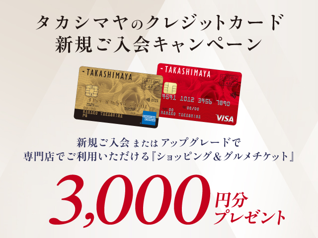 期間中、タカシマヤのクレジットカードにご入会、またはカードをアップグレードしていただいたお客様に、玉川高島屋S.C.専門店で使える『ショッピング&グルメチケット 3,000円分』をプレゼントいたします。お得なこの機会に、ぜひご入会ください。