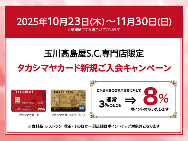 期間中、南館5Fカードカウンターにて、タカシマヤカードまたはタカシマヤカード《ゴールド》へ新規ご入会いただくと、入会当日のご利用金額に対し、通常3%のところ8%ポイントをプレゼントいたします。