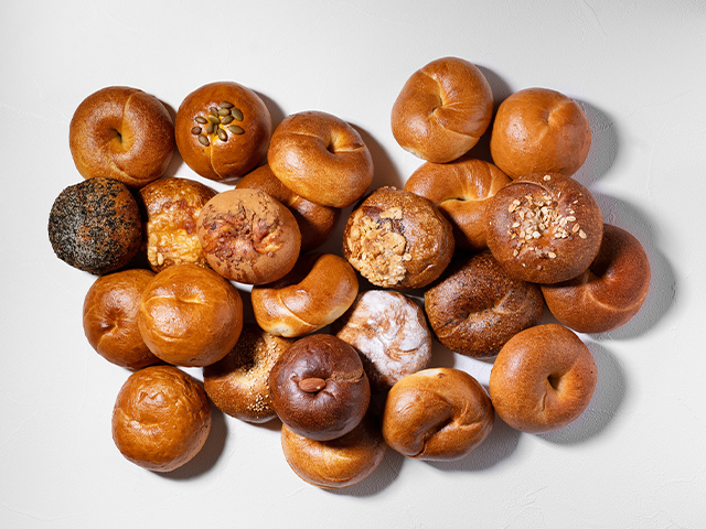 小麦粉・酵母・発酵時間を変えて作る『むぎゅ』『もち』『ふか』3種類の生地と、それぞれの生地に合わせたフィリングを使ったバラエティ豊かなベーグルをお楽しみください。