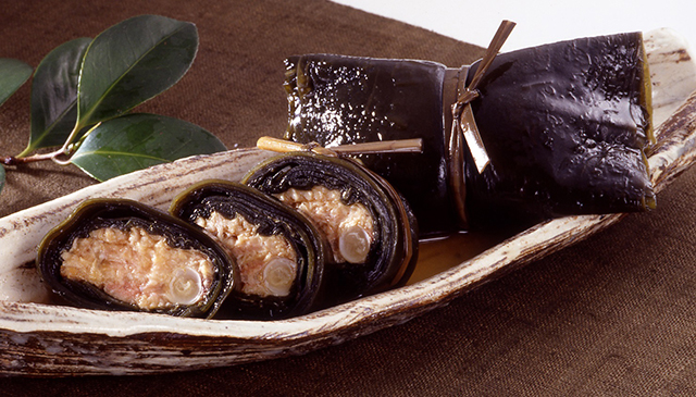 キングサーモン中骨を昆布で巻き、じっくり煮込んだ自慢の昆布巻きです。
