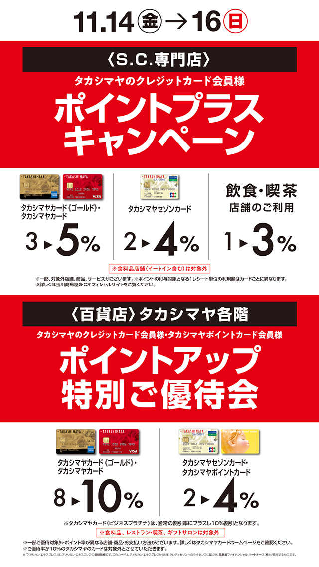 期間中、タカシマヤのクレジットカードによるご利用で、通常ポイントに加え 2% ポイントをプラスいたします。