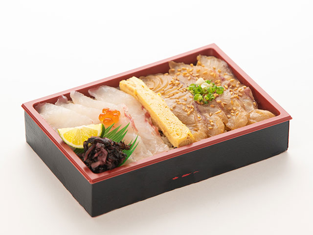 旨味を引き出す昆布〆と、特性胡麻醤油で和えた天然鯛。2つの味わいをお楽しみいただける料理屋のお弁当です。