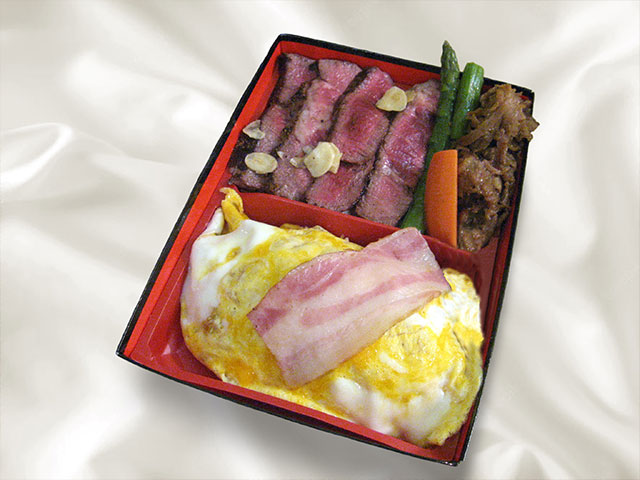 冷めても柔らかくジューシーなロースステーキと、味付けした牛バラカルビ肉、うす焼きたまごで包んだ白いご飯のボリューム満点なお弁当。