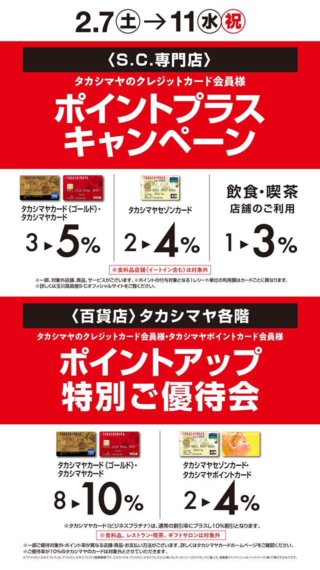 期間中、タカシマヤのクレジットカードによるご利用で、通常ポイントに加え 2% ポイントをプラスいたします。