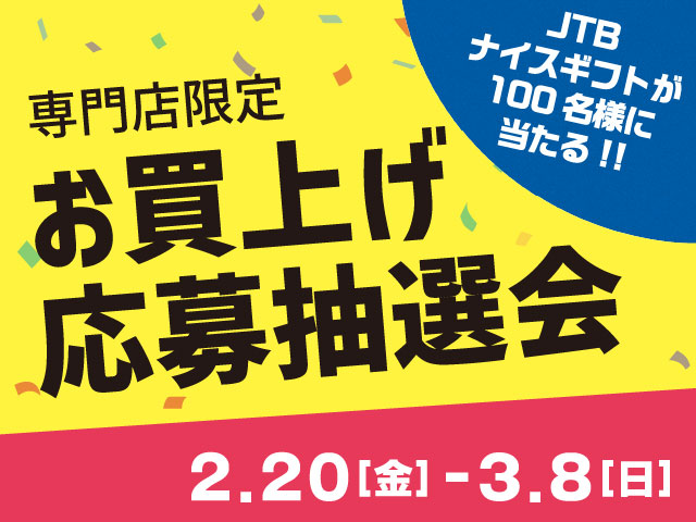 玉川高島屋S.C.専門店の対象店舗にて発行された期間中の税込5,000円以上(合算不可)のレシートを、応募会場(南館5F 特設会場)へお持ちいただくと、JTBナイスギフトが合計100名様に当たる、応募式抽選会にご参加いただけます。