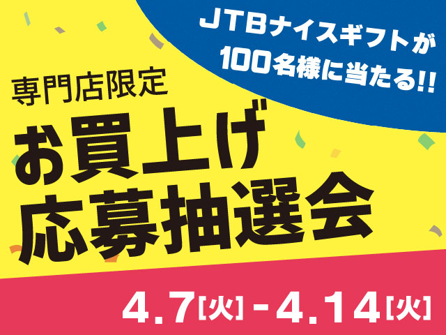 玉川高島屋S.C.専門店の対象店舗にて発行された期間中の税込5,000円以上(合算不可)のレシートを、応募会場(南館5F 特設会場)へお持ちいただくと、JTBナイスギフトが合計100名様に当たる、応募式抽選会にご参加いただけます。