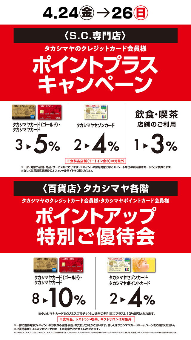 期間中、タカシマヤのクレジットカードによるご利用で、通常ポイントに加え 2% ポイントをプラスいたします。