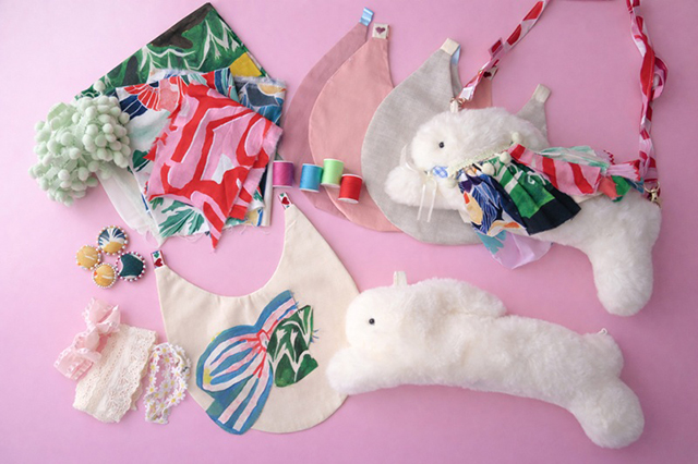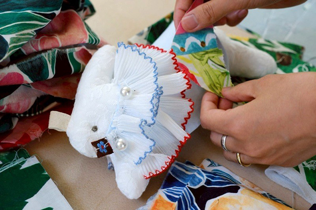 第1弾として、テキスタイルデザイナー・中澤楓さんの端切れや、個性豊かなボタンやリボンなど、さまざまな素材を自由に組み合わせて、ぬいぐるみのマント、耳飾りを作ります。