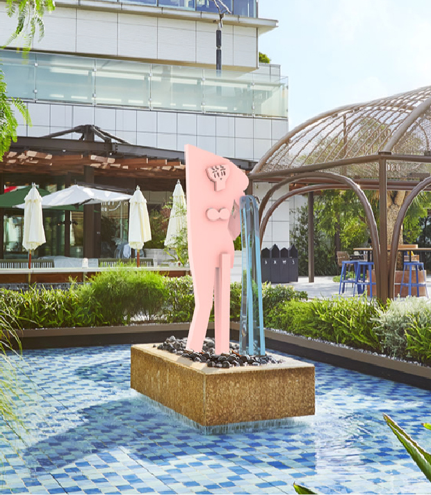 19世紀フランス絵画界の巨匠ジャン=オーギュスト・ドミニク・アングルの代表作《泉》という作品をモチーフにした立体作品です。元となったのは、水源や泉を擬人化したと言われる水瓶を持った女性が立っている絵ですが、この場所にぴったりだと思いました。