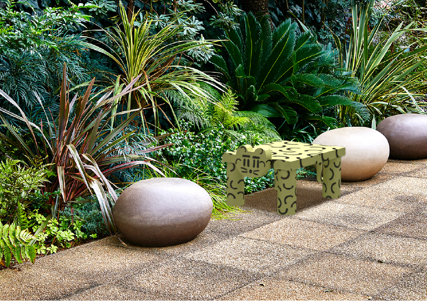 背景の植物の中に紛れるように、思いがけない動物がしれっといたら可愛いなと思ってここに置きました。隣の丸い形の椅子に紛れてこの虎もベンチとしても使えます。虎は縁起物の動物として注目していてよく自分の作品に登場しますね。