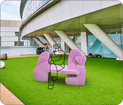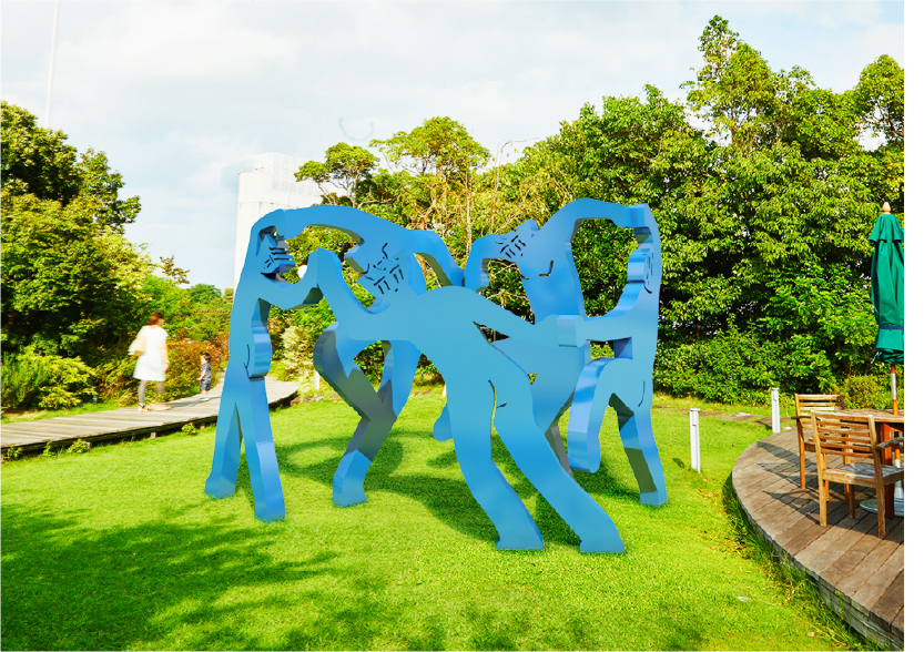 フランスの画家であるアンリ・マティスの《ダンス(Ⅰ)》という作品をモチーフにした作品。広い芝生の中で踊っている人々がいたら空間が楽しくなるかなと思ってこの場所を選びました。作品自体も人間よりは大きめなのでダンスしている人たちの間を潜ったりできます。
