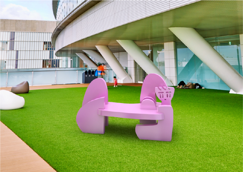 こちらもアンリ・マティスの《大きな横たわる裸婦》をモチーフにした作品。ここは直射日光が当たりにくい場所ですが、芝生で寝転んでくつろいでいる人が多いスペースだったので、座れる作品が合いそうだと思いました。