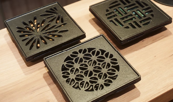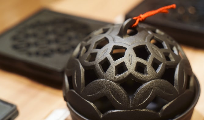 「桑名の鋳物は、江戸時代に鉄砲の製造を始めたことが起源と言われています。三重県内では着物の図柄となる伊勢型紙が育まれ、こちらの蚊やり器のデザインも、花火や朝顔、籠など夏の風物詩がデザインされています。柄によって、煙の立ち方が変わるのも楽しいですよ」