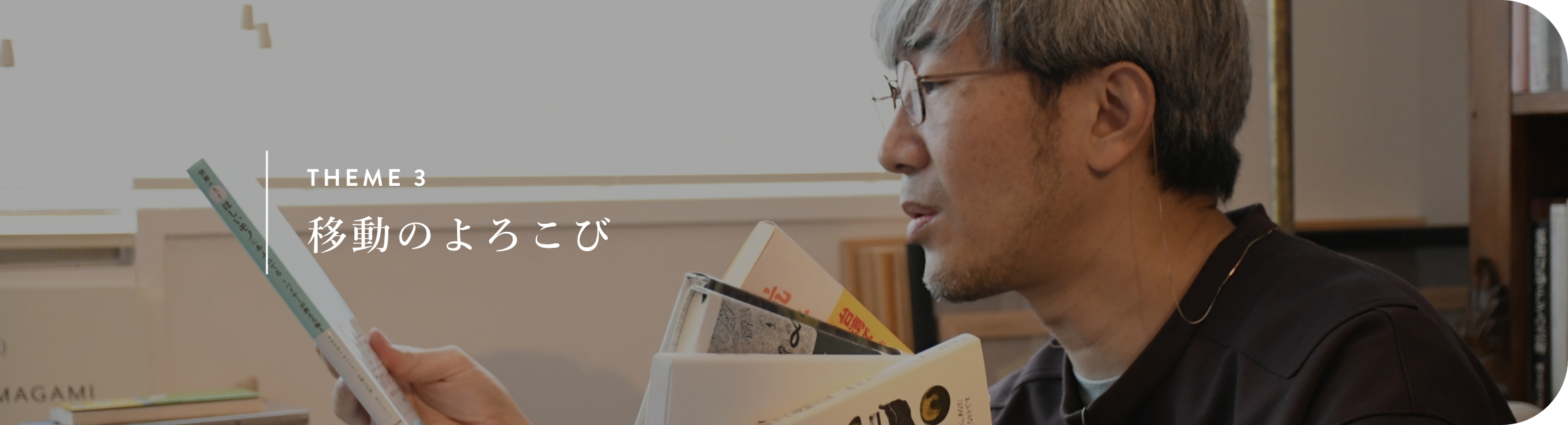 移動する過程で感じる土地の空気、少しずつ変わっていく景色、突然の動物との出会い、それらを五感で感じられるのが移動の魅力です。他にも、移動中に駅弁や機内食を楽しんだり、ドライブの合間にふらっとお店に立ち寄ったり、垣間見える車窓風景に想いを巡らせたり。この棚では、移動そのものの喜びに焦点を当てて本を選びました。