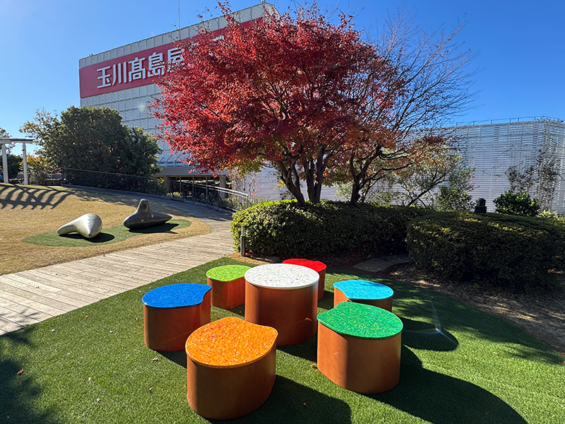 二子玉川事業所」と共創して、玉川高島屋S.C.の本館屋上に約2万個のペットボトルキャップを使用した「花びらベンチ」を設置しました。