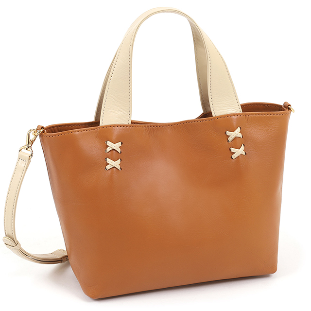 持ち手の付け根にあしらった革飾りが目を引く、2wayハンドバッグ。
