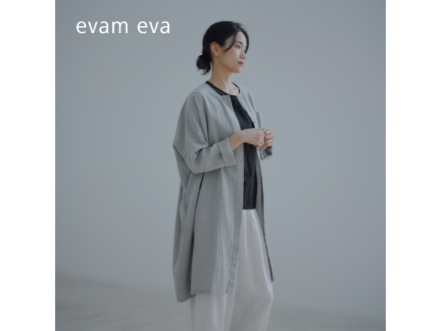 店頭には、澄んだ色合いの水撚りリネンのアイテムや、奥行きのあるシャンブレー生地で仕立てたシャツやジャケットなど、軽やかな装いが並びます。