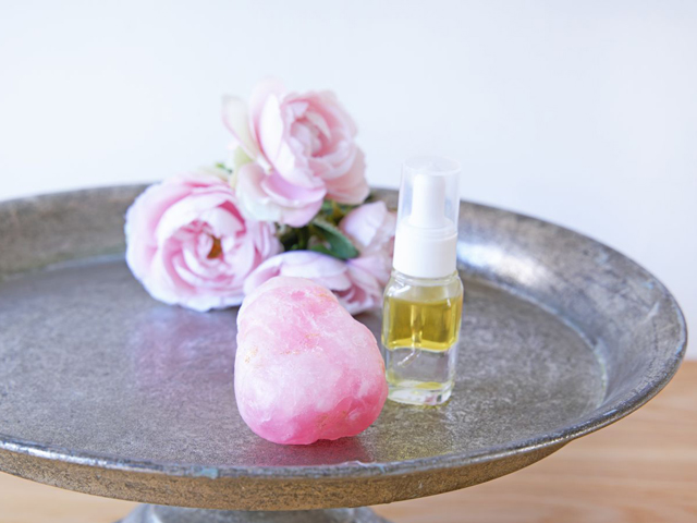 魅力的な「ブルガリアンローズ」の世界をたっぷり学んだ後は、宝石のローズクォーツに似せたジュエルソープと、二層に分かれたオイルセラムづくりをお楽しみいただきます。