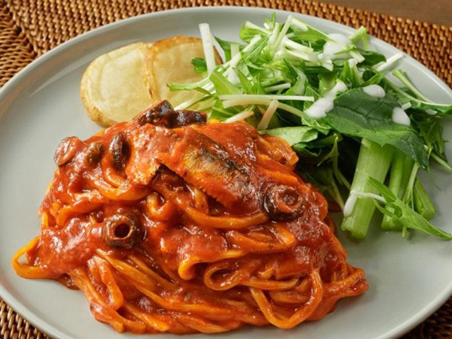 焼きいわしとオリーブのトマトパスタ