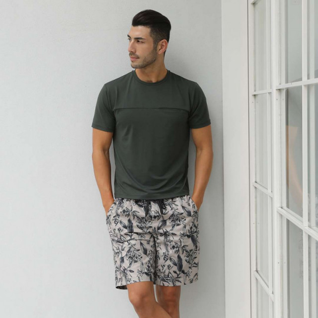 リゾート感あふれるハーバルボタニカル柄が印象的な、上品なメンズサーフパンツ。