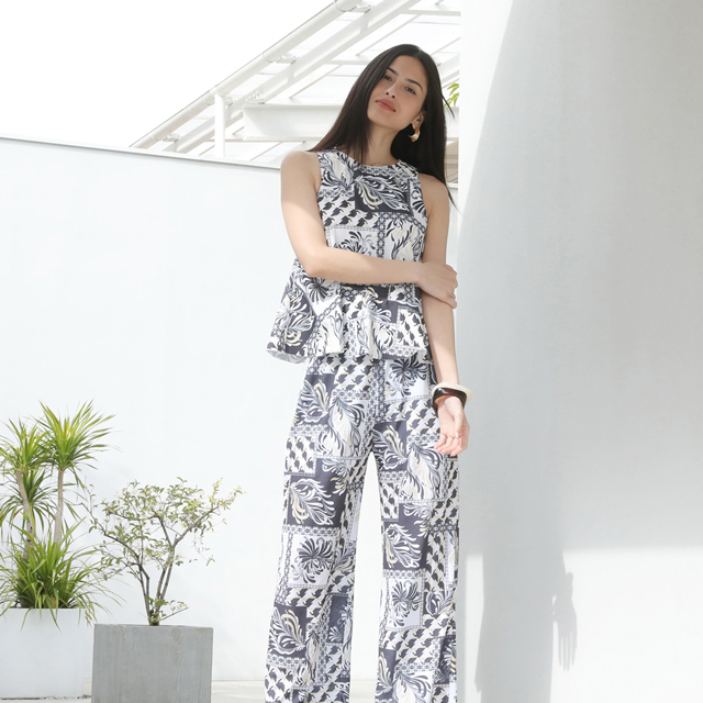 落ち着いた色合いの中に華やかさを感じるデザインで、大人のリゾートスタイルをさりげなく演出。ビーチやプールはもちろん、リゾートホテルやスパなどのシーンにも映える一着です。