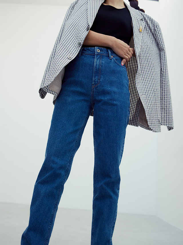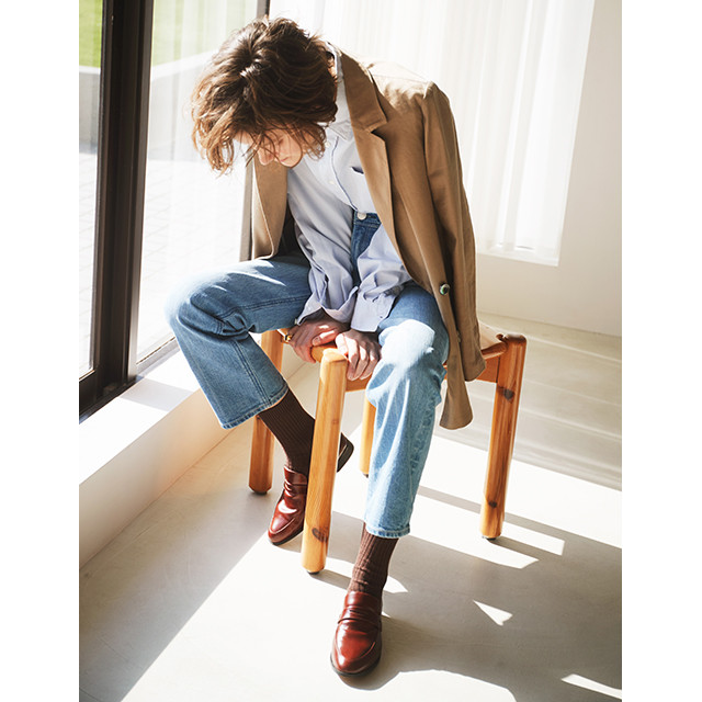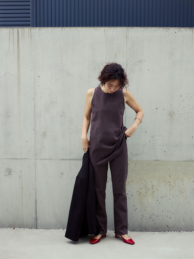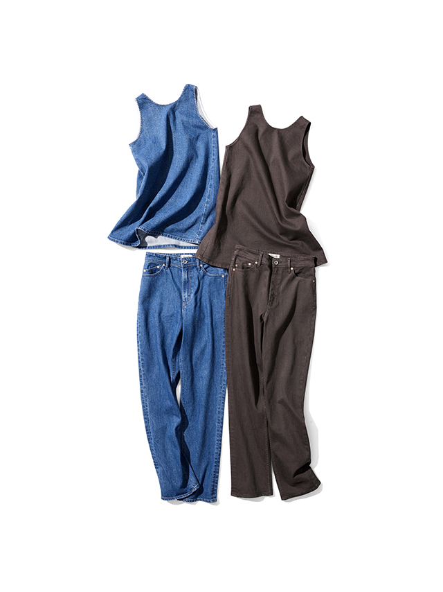 ほどよくゆとりを持たせたオーセンティックなストレートデニムと、女性らしさが香るスリーブレスプルオーバーをご用意。デニムでもきちんと見えるスタイルを意識し、大人が気負わず着られるデザインに仕上げました。