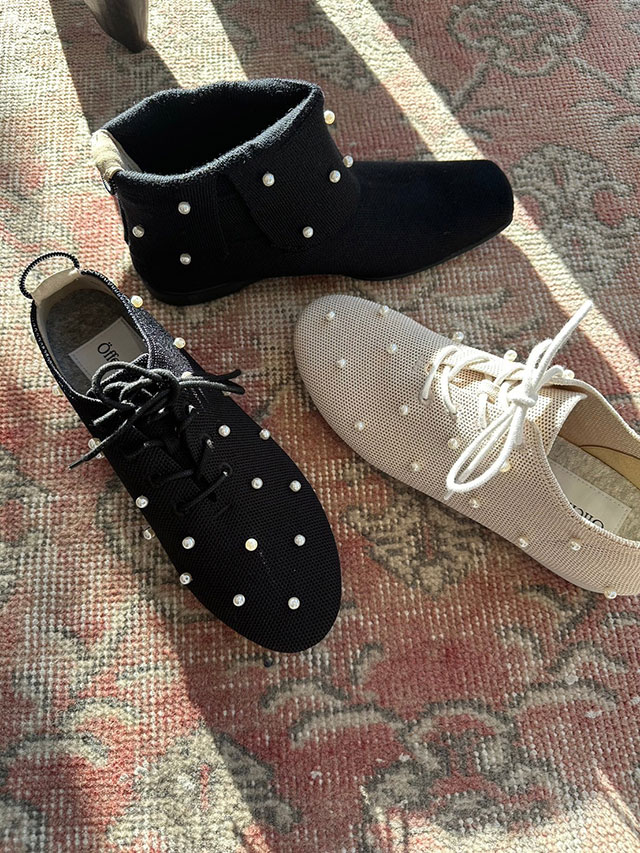 ラメ感のあるメタリックな糸をミックスしたパンプスや、大胆にパールを散りばめたブーツなど、パーティやオケージョンシーンを華やかに演出するアイテムをラインアップ。