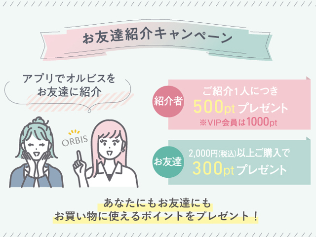 「オルビス公式アプリ」よりご友人をご紹介のうえ、商品をご購入いただくと、ご紹介いただいたお客様、ご友人、お二人ともにお得なポイントをプレゼントいたします。