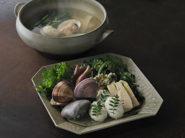 ふっくらと肉厚な蛤とやわらかな蛤真薯を主役に、瑞々しい歯ざわりの筍と若布を合わせ、芽吹き野菜の持つ“にがみ”とともに召し上がっていただく滋味深い鍋。