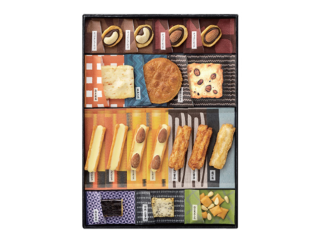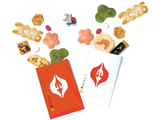 年号をかたどったおかきや、吉祥を象徴する松や梅、長寿を表す海老せんべいなど、縁起の良い米菓を詰合せました。
