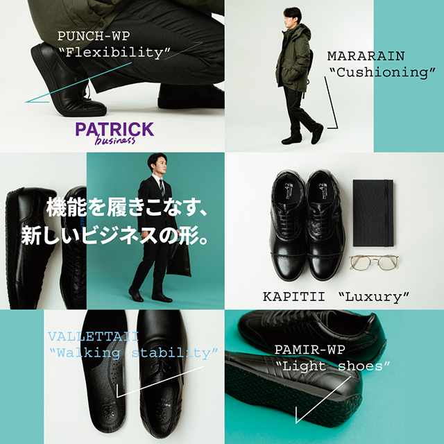 柔らかい防水レザーを使用したモデルや、ガラスコーティングを施した革靴風のスニーカーなど、快適なビジネスシューズを、ぜひご覧ください。